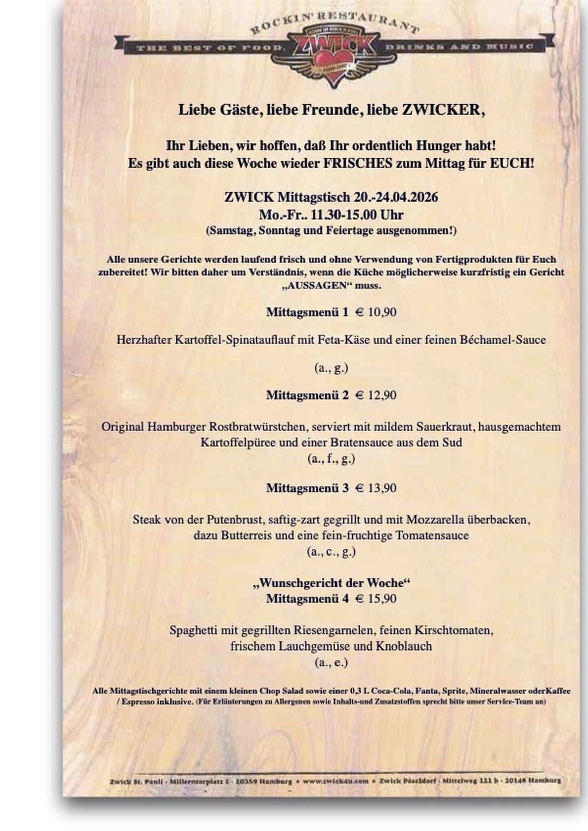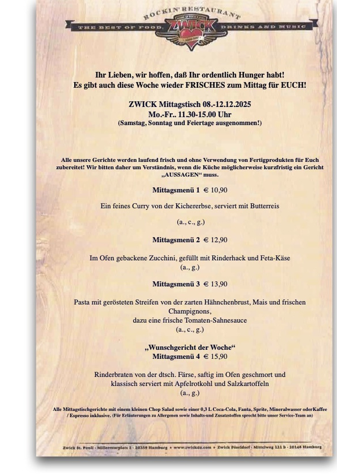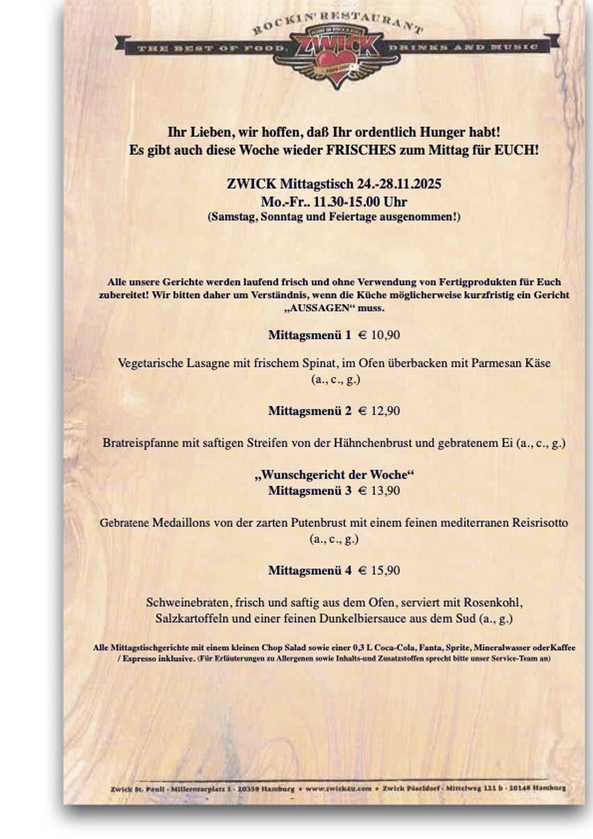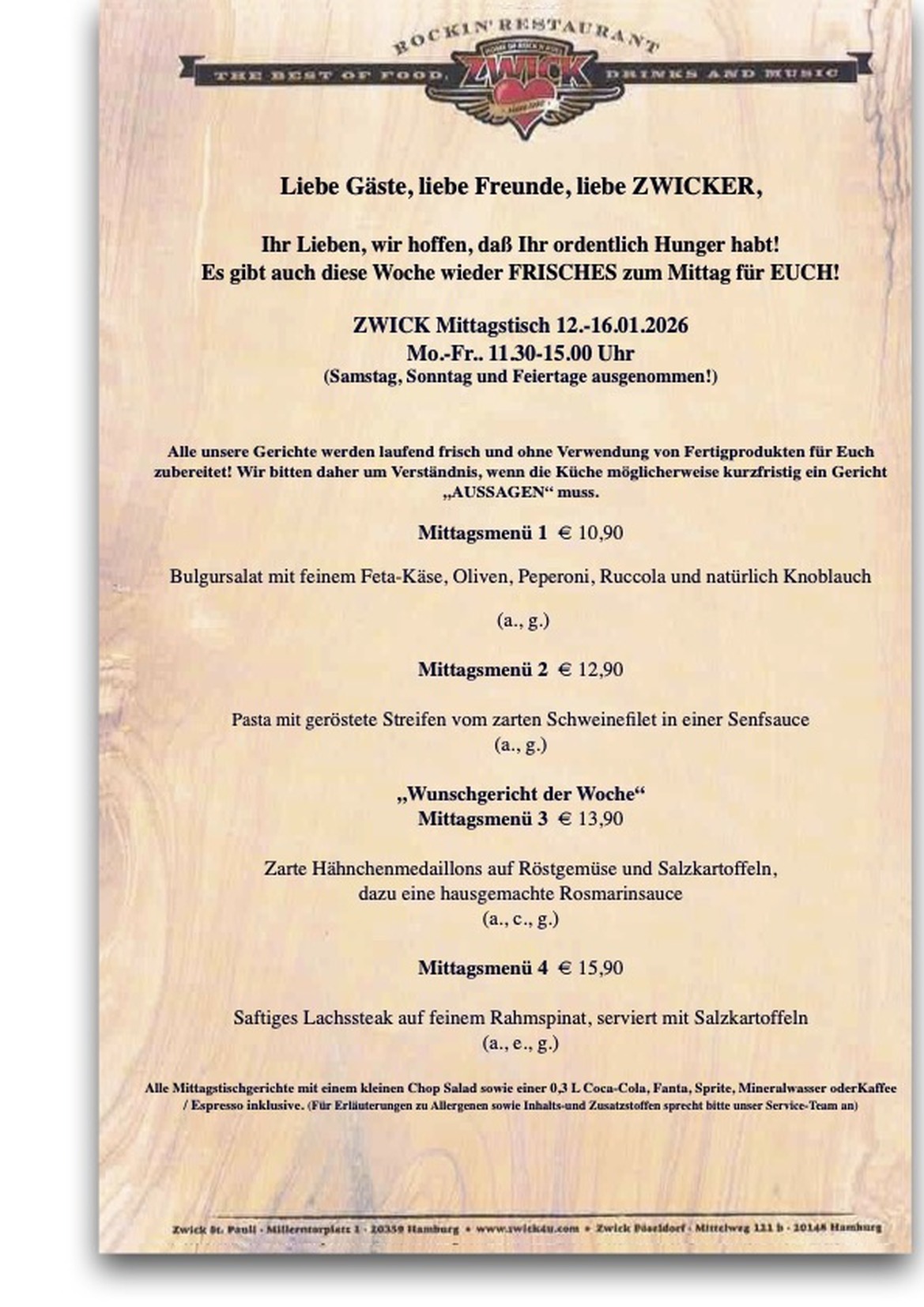 Während unserer Mittagstischzeiten könnt Ihr auch ALLE Gerichte aus unserer Speisenkarte bestellen und genießen!
